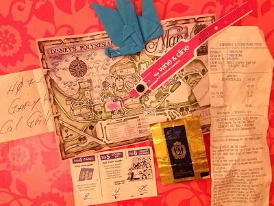 It still contains the necessities of a magical trip: my Tables in Wonderland card, our Annual Passes, Disney’s Photopass cards, and of course, the Disney Visa card. It contains goodies that I will never remove: a shopping receipt from Disneyland Paris, our Leave a Legacy location finder, the phone number of our favorite waiter at the California Grill, a pen from the Disneyland Hotel circa 2001, my first Disney Wine & Dine Half Marathon wristband, and most recently, a mint wrapper from Club 33.